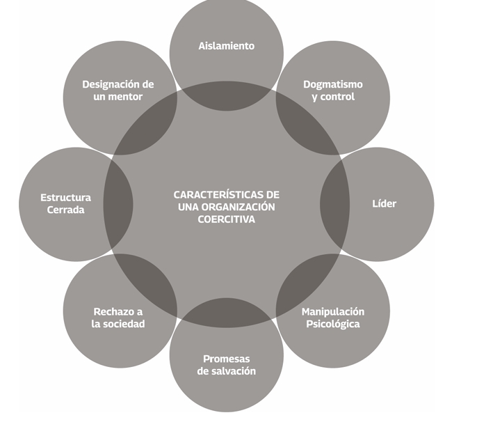 Las organizaciones coercitivas no se limitan a grupos religiosos o espirituales; pueden adoptar otras formas: comunidades terapéuticas, entidades deportivas, grupos de estudio y debate, que pueden ser sobre filosofía, psicología, prácticas de meditación, emprendimientos comerciales exitosos, entre otros. Todas ellas presentan características idénticas respecto de la relación con sus comunidades, ejercen un control absoluto sobre sus vidas. Los pensamientos ya no le pertenecen a cada una de las personas, sino que se transforman en “colectivos”.